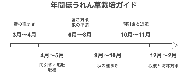 | 12月~2月 | 収穫と防寒対策 | 秋まきのほうれん草は寒さに強く、霜が降りる時期でも育つ。防寒対策としてマルチや不織布を使用する。 |